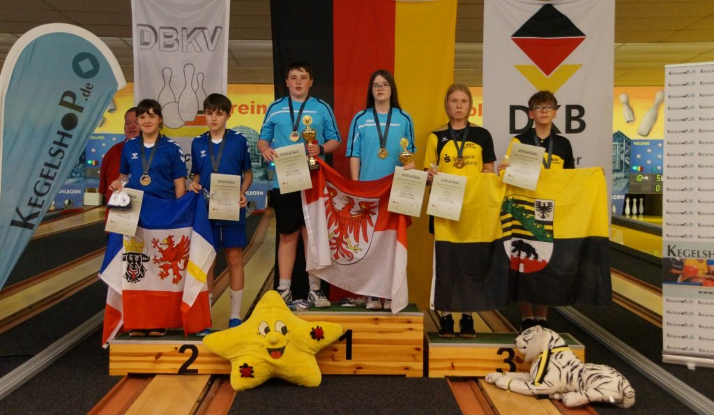 Den Anfang am Samstag machten die U14 Mixed Teams. Dabei startete Levin Splieth mit Charleen Rose Sandow und Lennart Stoof mit Ruby Reimer. Während es für Levin und Charleen jeweils die ersten Deutschen Meisterschaften Dreibahnen waren, zeigten sie mit 714 Holz eine gute Leistung und belegten einen guten 7. Platz. Die „alten Hasen“ Lennart und Ruby zeigten an diesem Tag, warum sie Nationalspieler sind. Sie gewannen die Deutsche Meisterschaft im Mixed mit 776 Holz und holten sich somit den ersten zu vergebenen Titel.